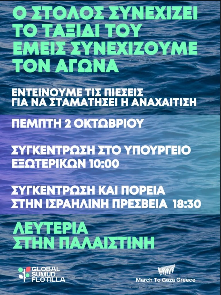 Στον ορίζοντα η Παλαιστίνη, 50 ΝΜ μακριά. Η ελπίδα κρατά καλά ανάμεσα από τις κρεατομηχανές του Ισραήλ. Ο Παύλος Φύσσας το Οξυγόνο των παιδιών από τα Τέμπη και ο Βαγγέλης Πισσίας συνεχίζουν ανάμεσα στα αναχαιτισμένα πλοία του ανθρωπιστικού στόλου για την Γάζα.